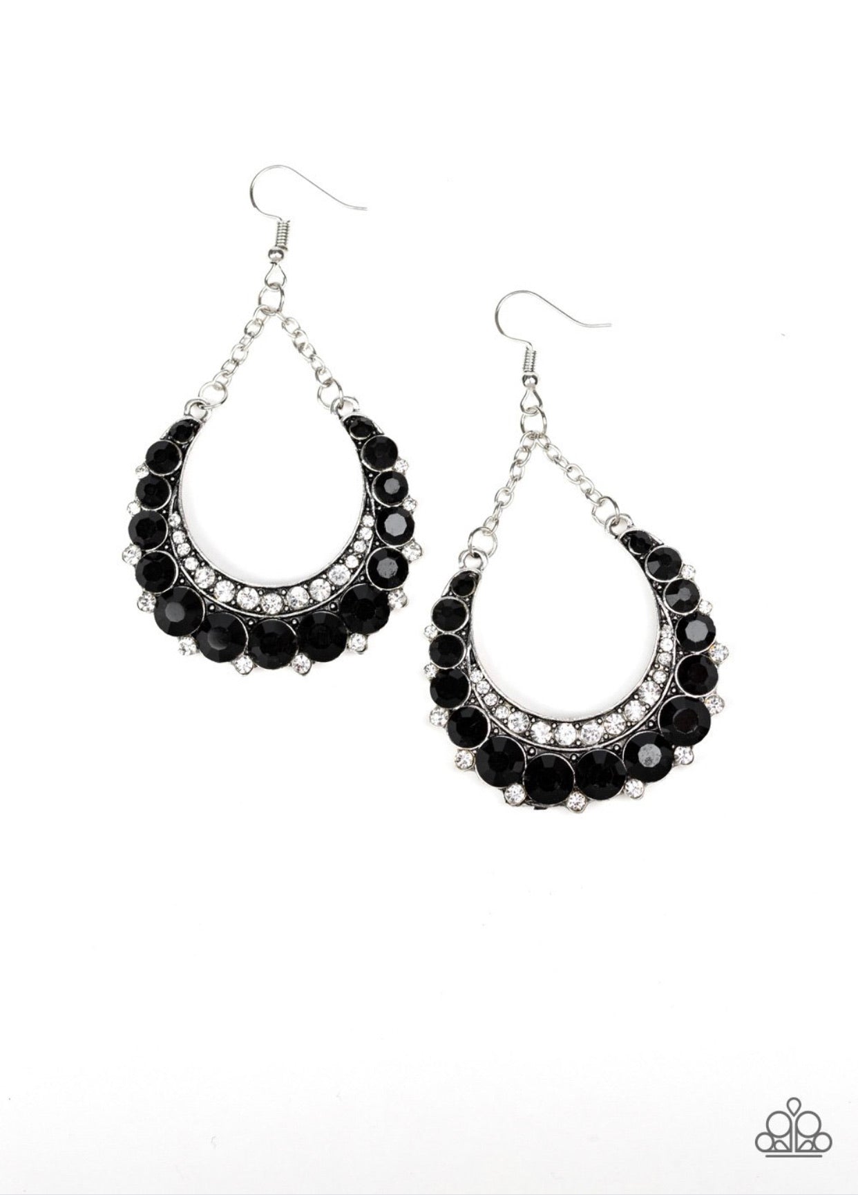 As if dipped in glitter, the bottom of a black rhinestone encrusted silver frame is bedazzled into a collection of glassy white rhinestones. The glamorous frame swings from silver chain fittings for an edgy finish. Earring attaches to a standard fishhook fitting.