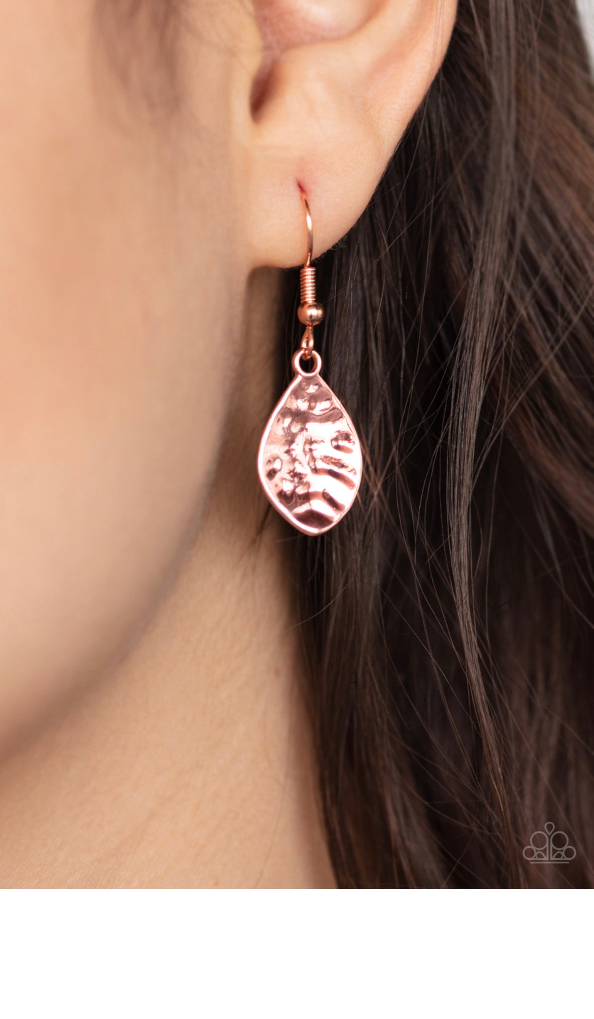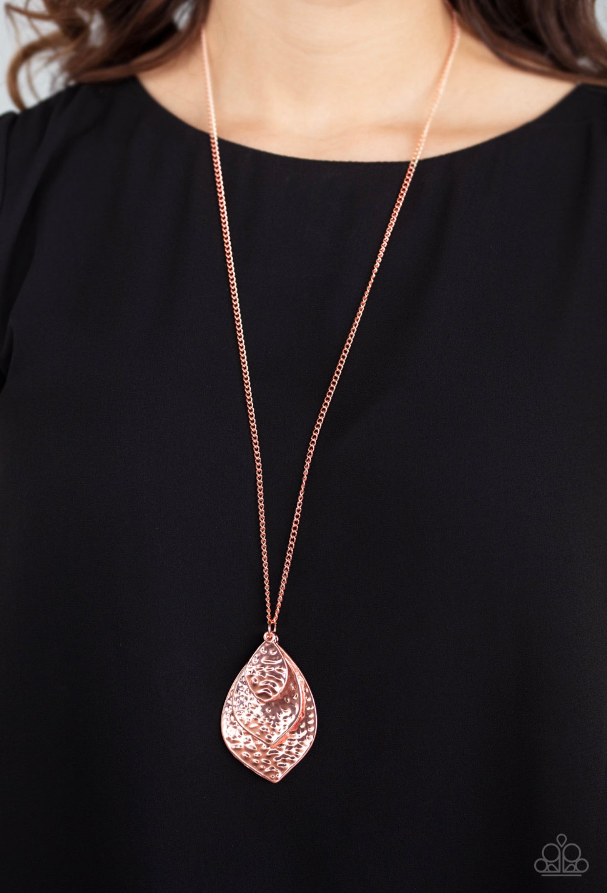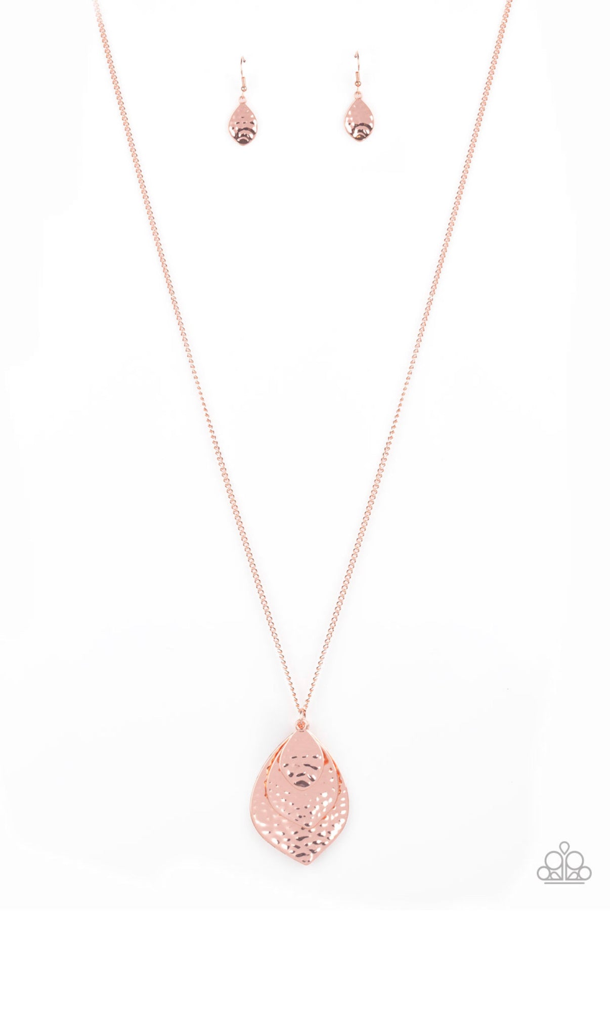 Gradually increasing in size, a trio of delicately hammered shiny copper leaf frames swing from the bottom of a lengthened shiny copper chain, creating a whimsically stacked pendant. Features an adjustable clasp closure.