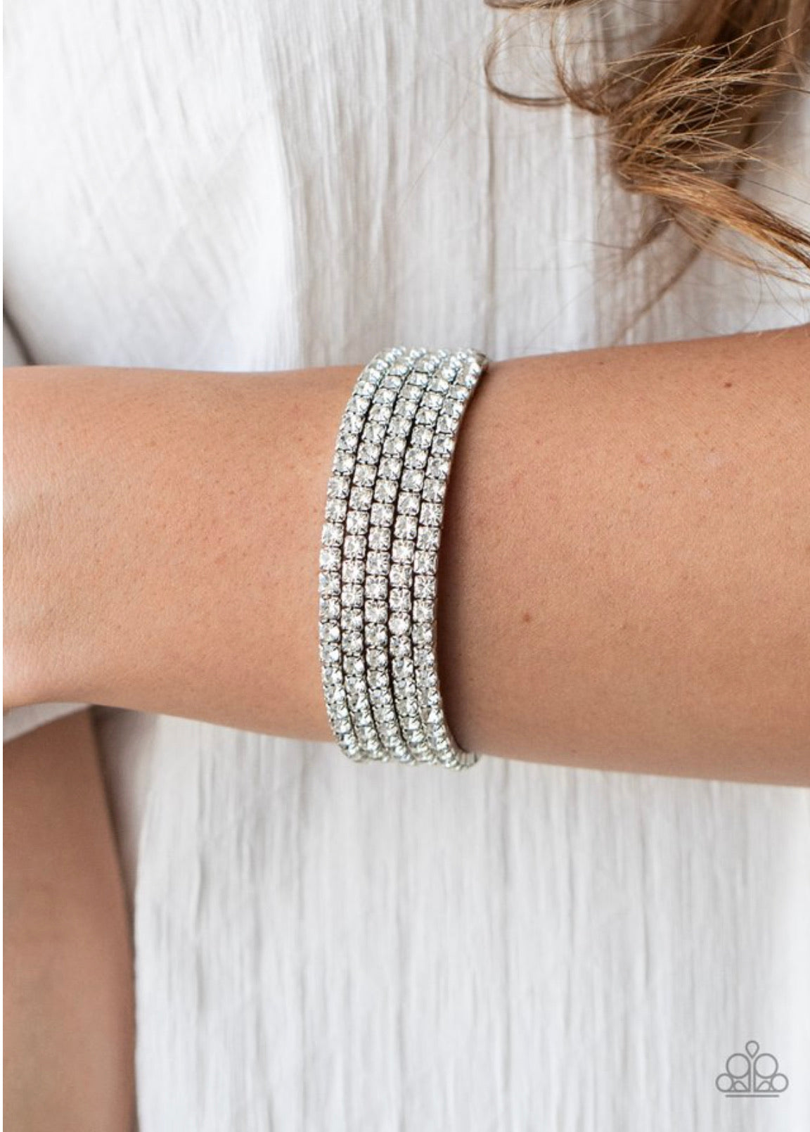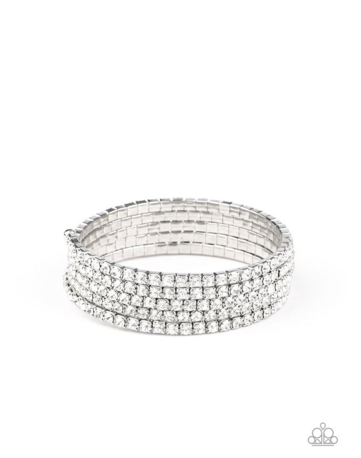 Encased in sleek silver fittings, row after row of glassy white rhinestones coil around the wrist, creating a blinding infinity wrap bracelet.
