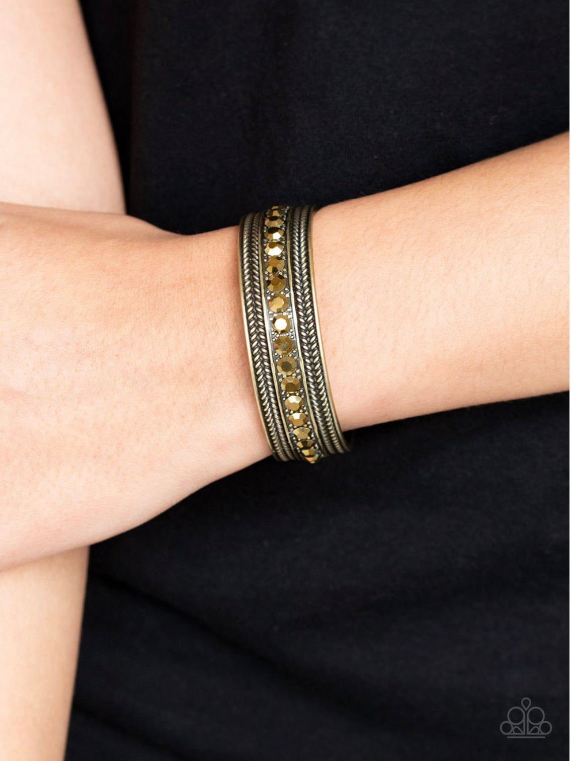 A row of glittery aurum rhinestones are encrusted down the center of a studded brass cuff for an edgy look.
