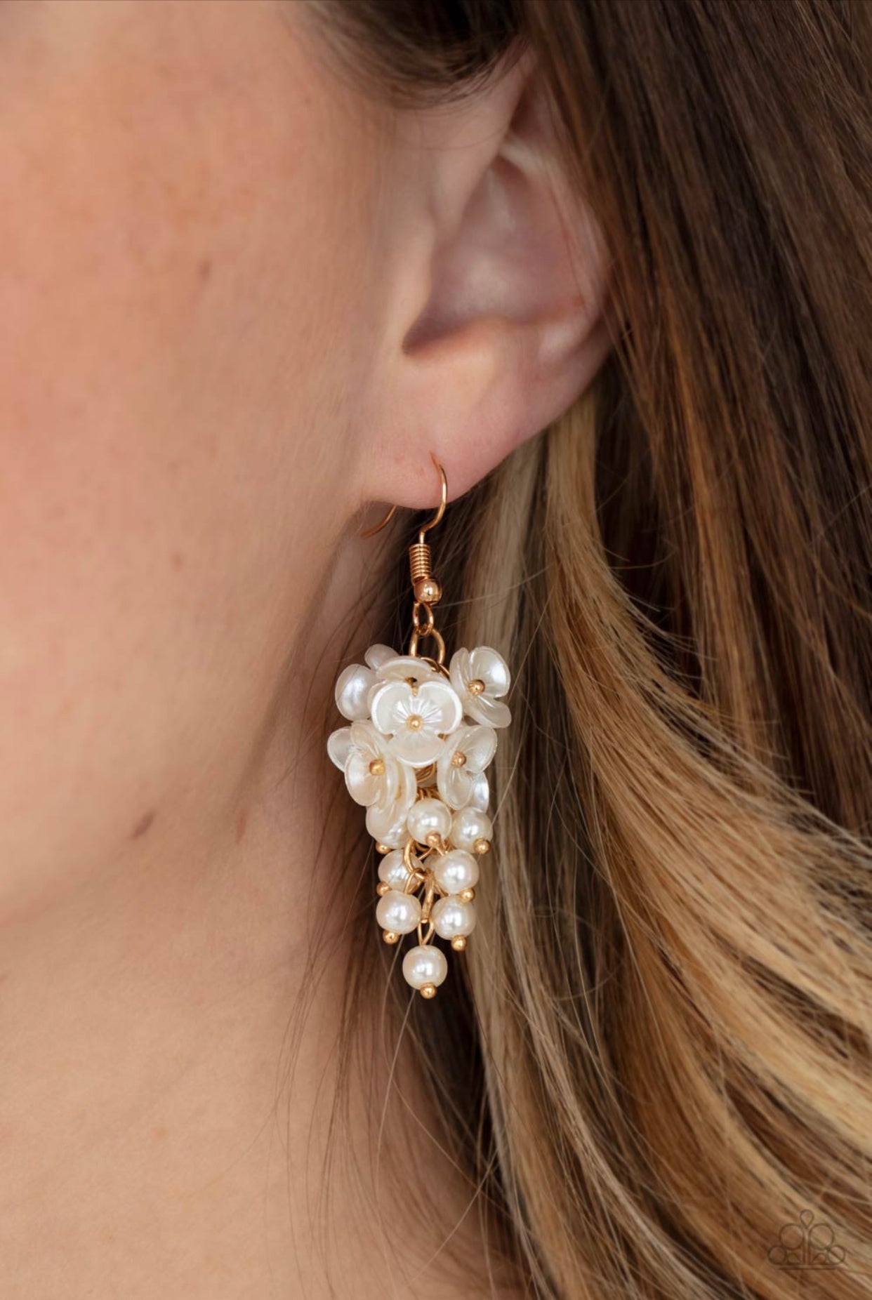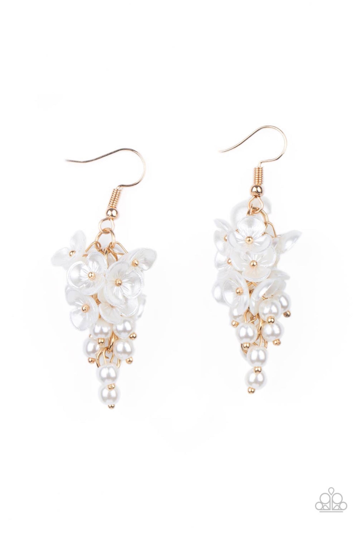 A cluster of pearly white floral frames and dainty white pearls trickle from a gold chain, creating a romantic chandelier. Earring attaches to a standard fishhook fitting.