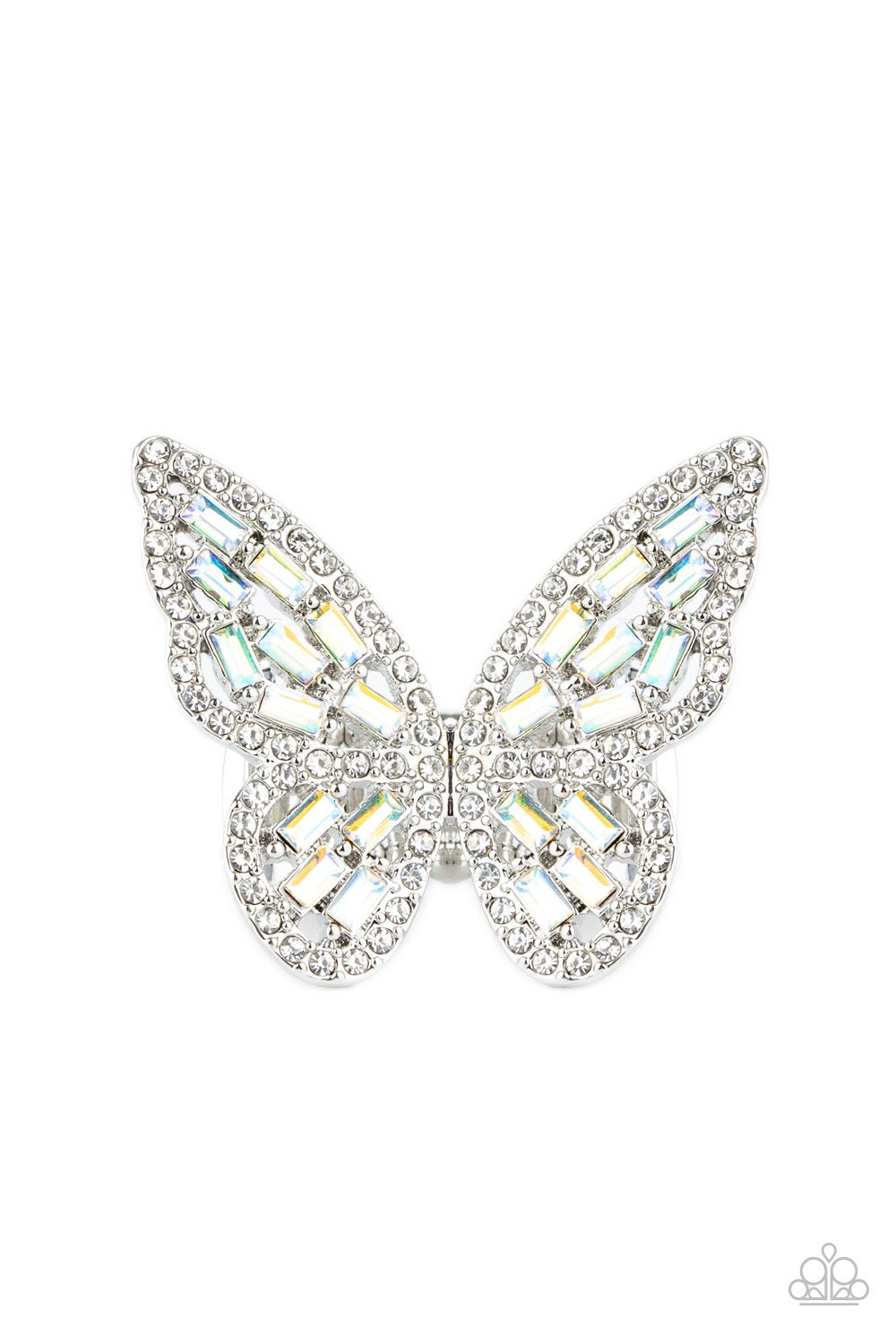 Dainty iridescent emerald style rhinestones are sprinkled across the wings of a silver butterfly that is encrusted in glassy white rhinestones for a dramatically dazzling finish. Features a stretchy band for a flexible fit.