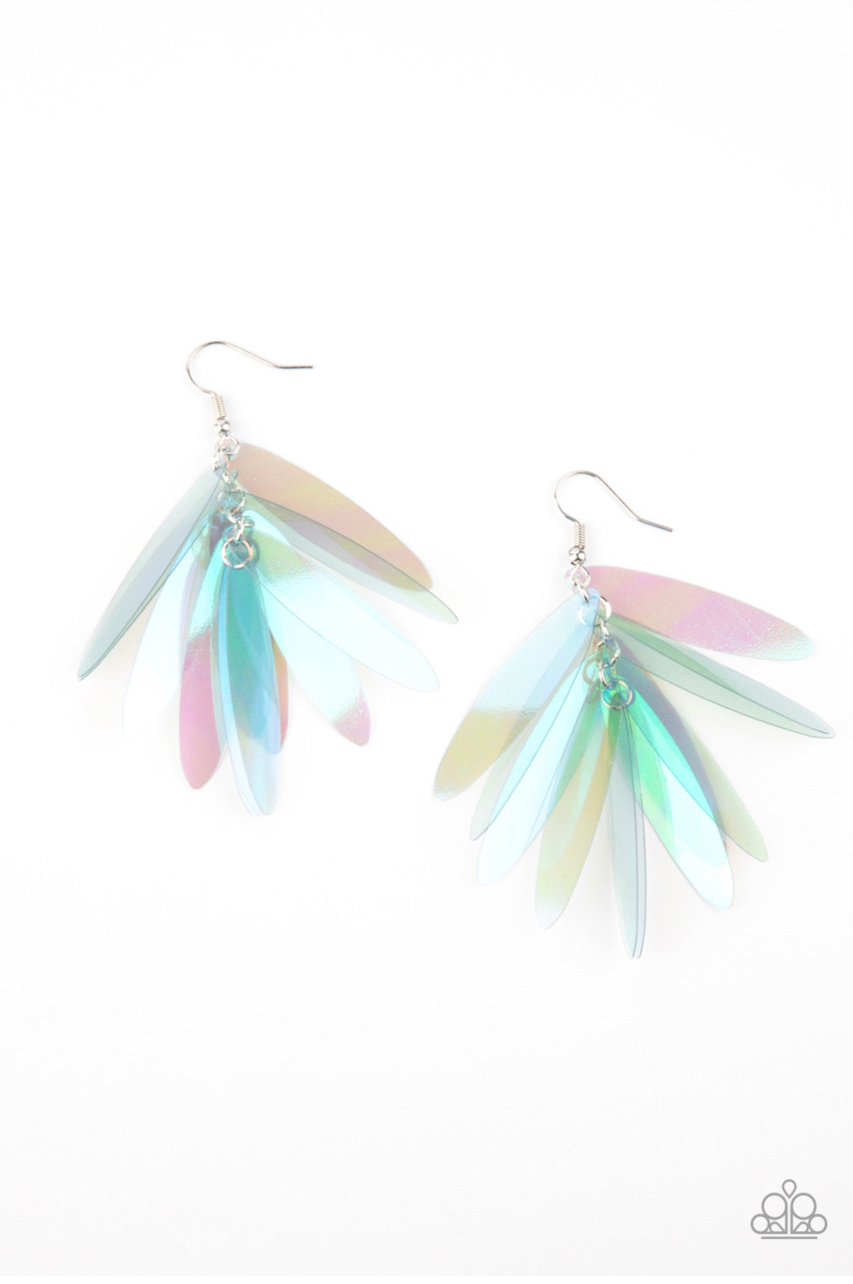 Featuring an iridescent shimmer, elongated oval sequins swing from a dainty section of silver chain, creating a colorfully clustered fringe. Earring attaches to a standard fishhook fitting.