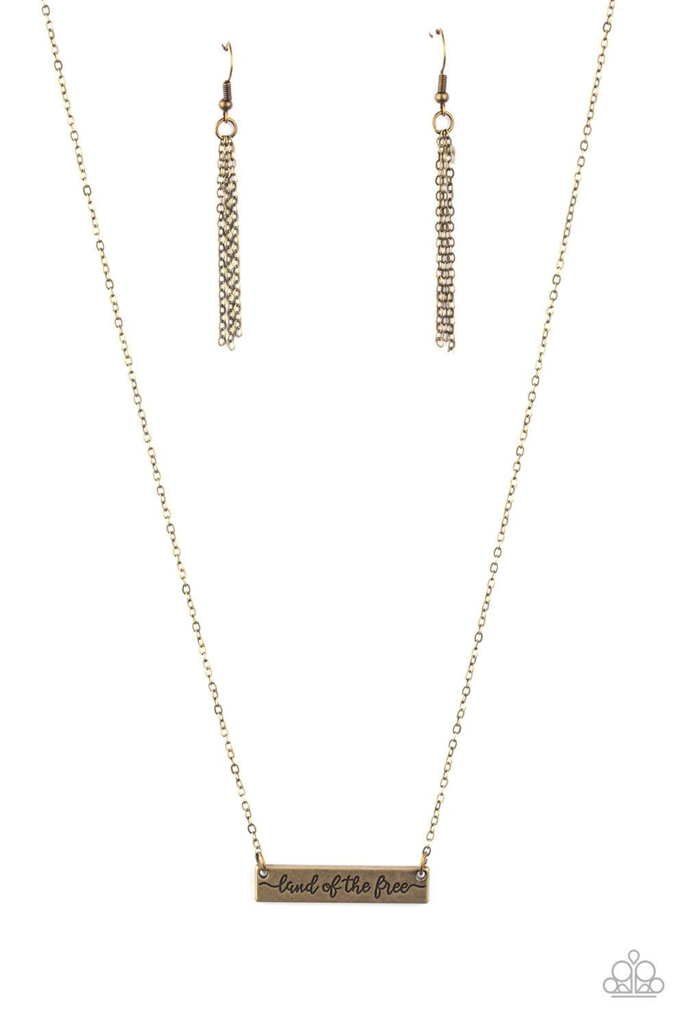 Stamped in the phrase, "Land of the free," a brass rectangular frame is suspended by a dainty brass chain below the collar for a patriotic inspired look. Features an adjustable clasp closure.