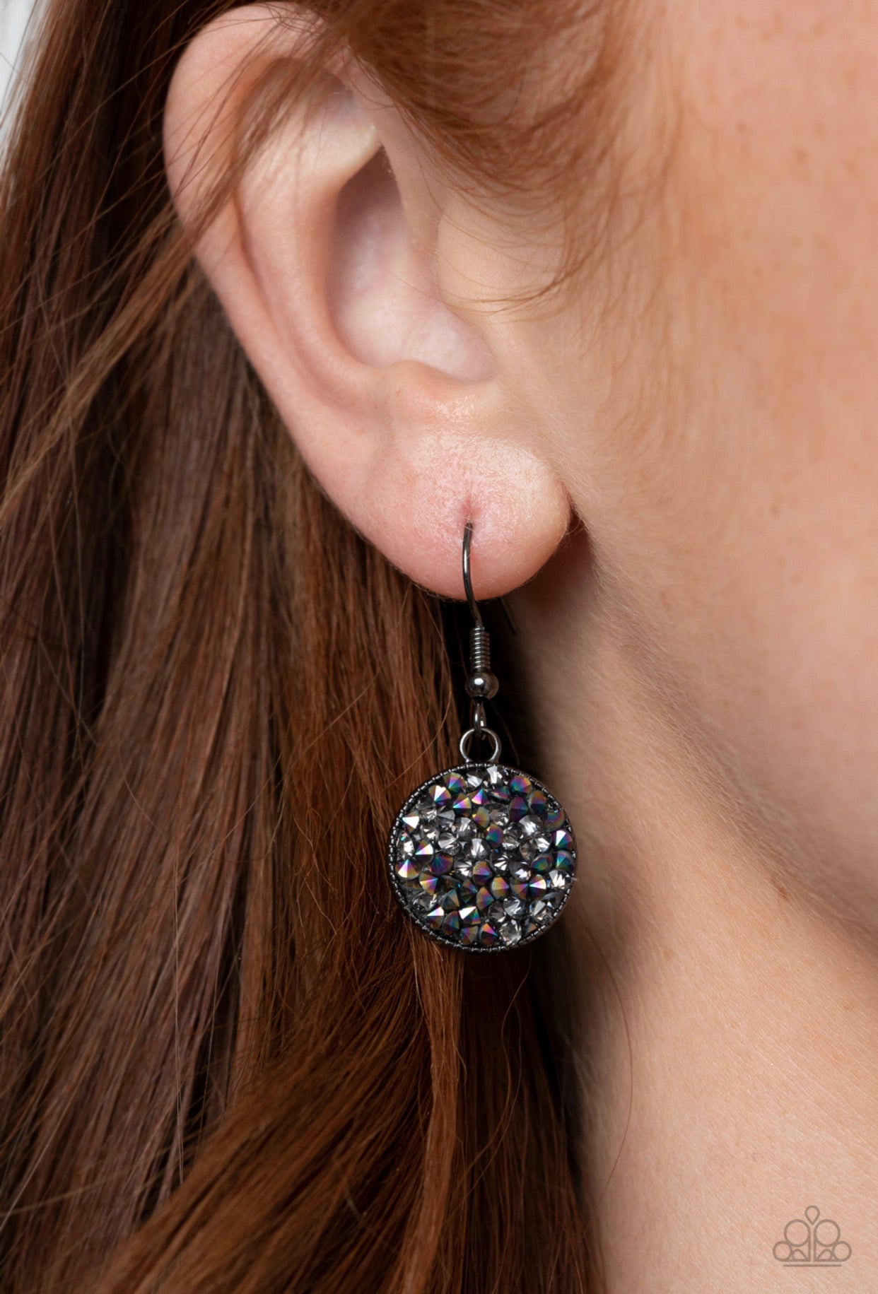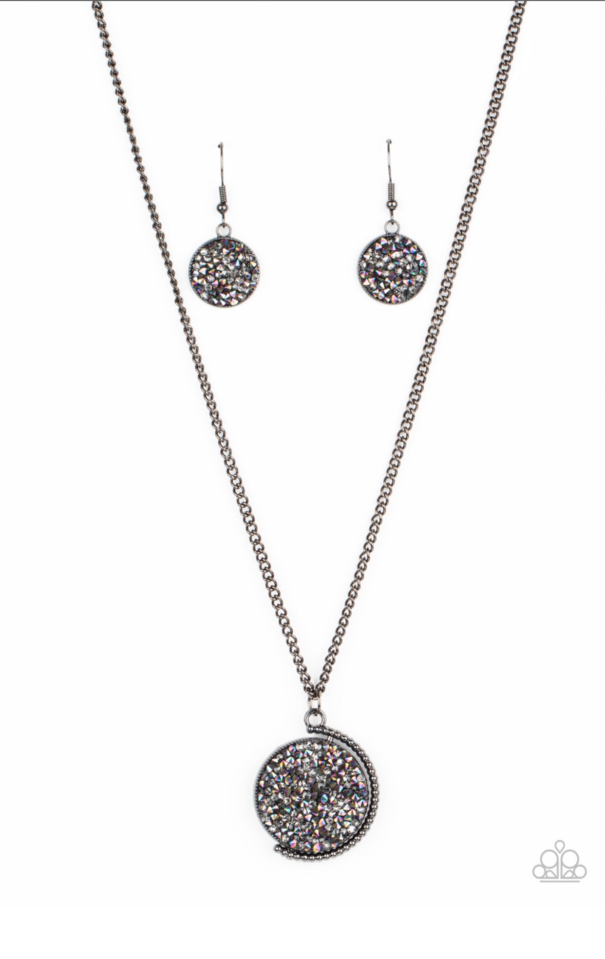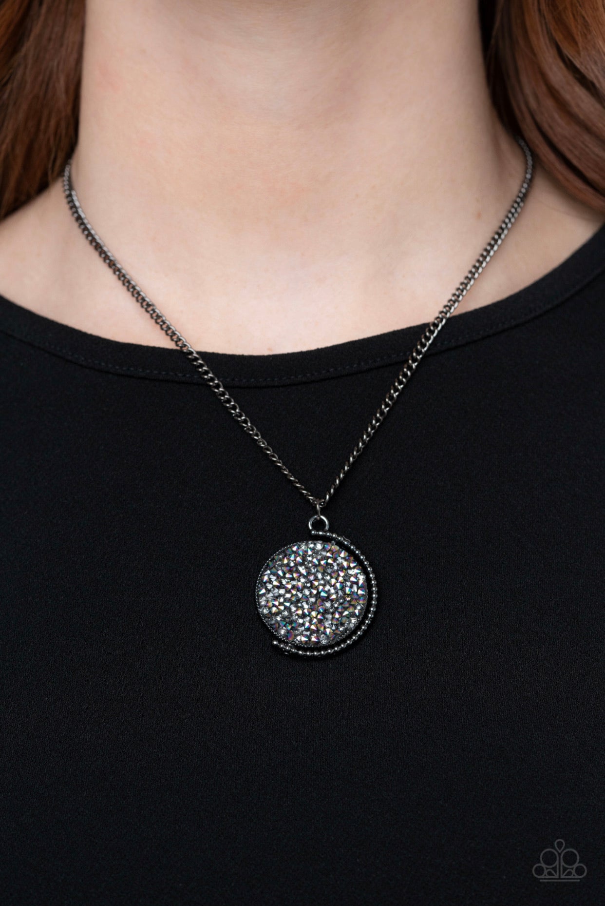 A smoldering collision of oil spill and hematite rhinestones are encrusted across the front and back of a textured gunmetal disc below the collar. Threaded along a dainty rod, the glittery pendant effortlessly spins on its axis inside a gunmetal studded half-circle frame. Features an adjustable clasp closure.